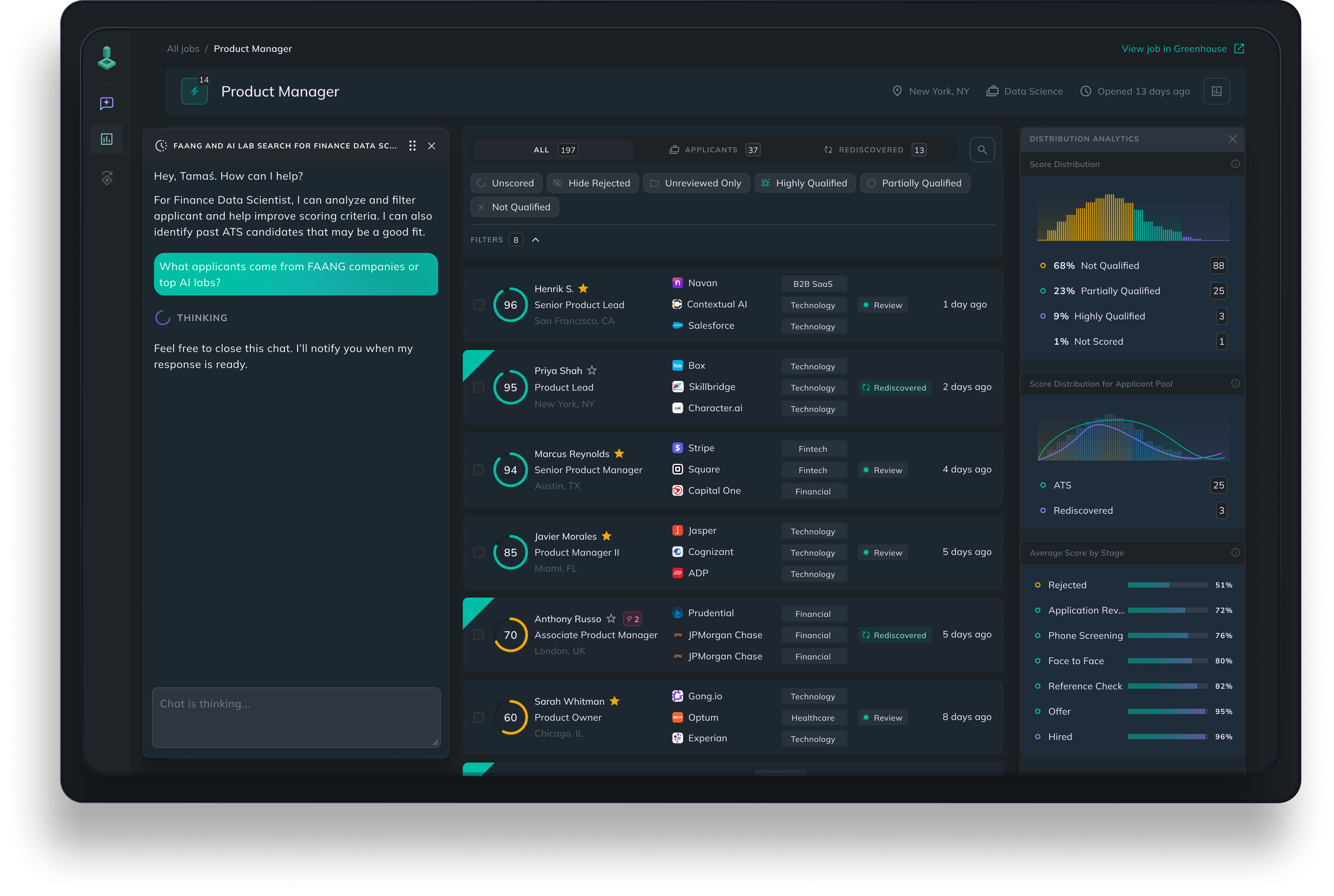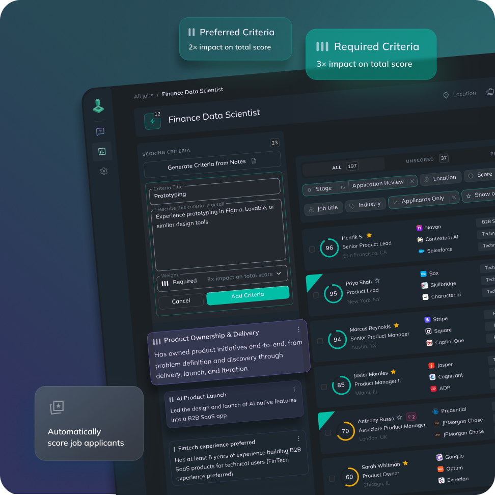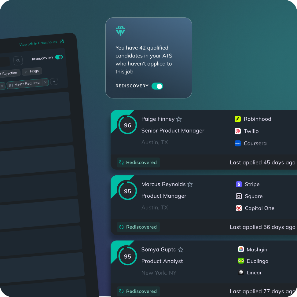 Add AI agents to your existing ATS in minutes. Screen smarter, source faster, and recover lost candidates — no rip-and-replace required.