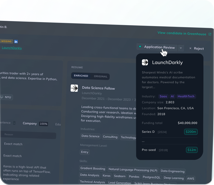 Enrichment brings deep intelligence about the candidate and their work history that often isn't found on a resume. This includes most firmographic data, including company industry, size, growth, funding, department growth, and hundreds of other indicators. This allows you to search for things like "show me candidates from high growth VC backed cyber startups